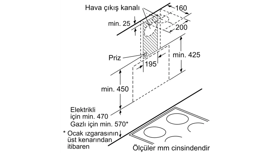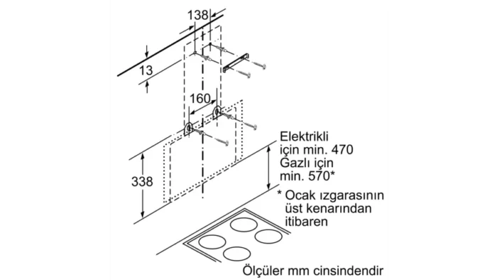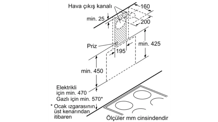 Elektrikli ocak üzerindeki minimum mesafe: 470 mm