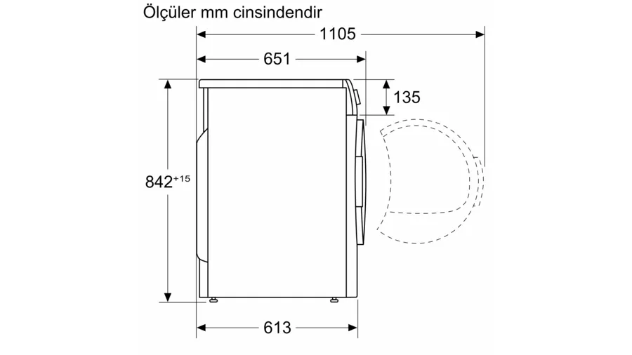 Kapağı 90 derece açık olduğunda ürün derinliği 1.105 mm